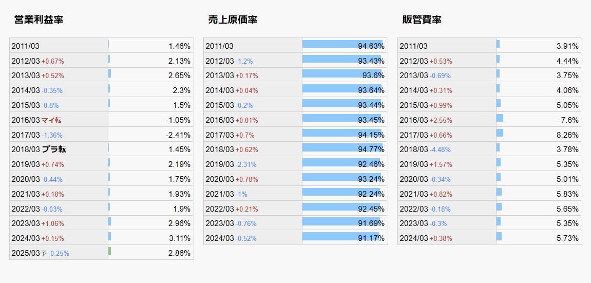 原価率など。下がってなくもないけど、これを傾向で長期にもっと原価率さがるとかみるのが妥当かどうかならどうでしょうね。
