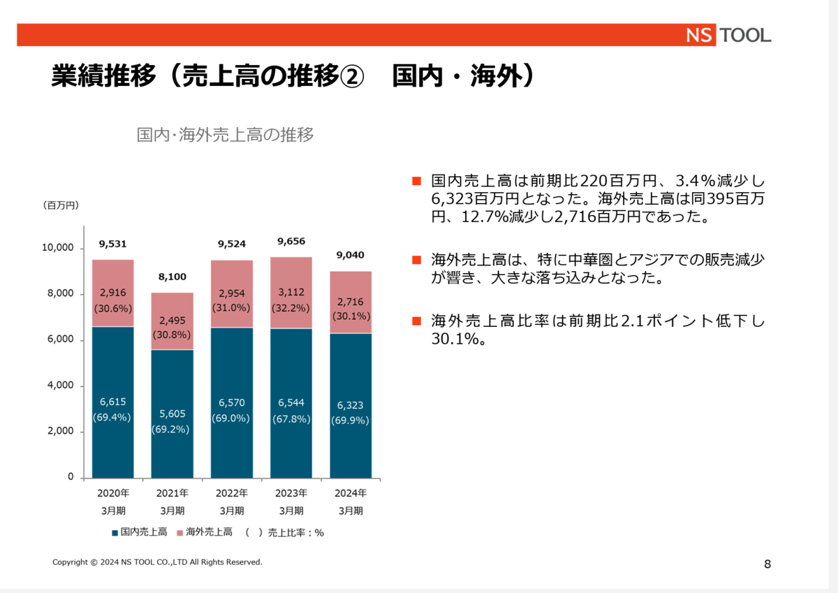 ファンダ的には、エンドミル工具。基本増収時により増益減収時により減益のシクリカルな製造業にはなるが、利益率も高く業績自体は安定で財務もド健全でわりと優良企業然とはしてるんだけどコロナ辺りまで続いた成長がコロナ後は他業界の不調に引っ張られ回復が進まない感じはあり足踏みでROEが下がってきてる感じはありますのをどうみるか。この先の復調をみるかですがひとまず目先は足踏み感。