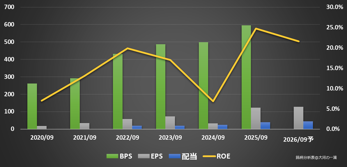 ROEは20.7%まで上昇し、2026年9月期予想でも約21%が見込まれている。長期的にBPS・EPSとも高い成長率で積み上がっており、「BPS成長+配当」で10%超リターンを狙うという今回のスクリーニング条件にはきれいに合致するタイプ。IRBANK+1
