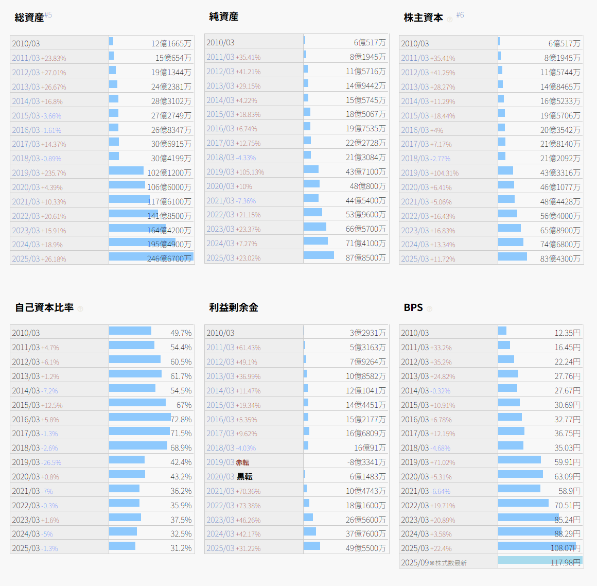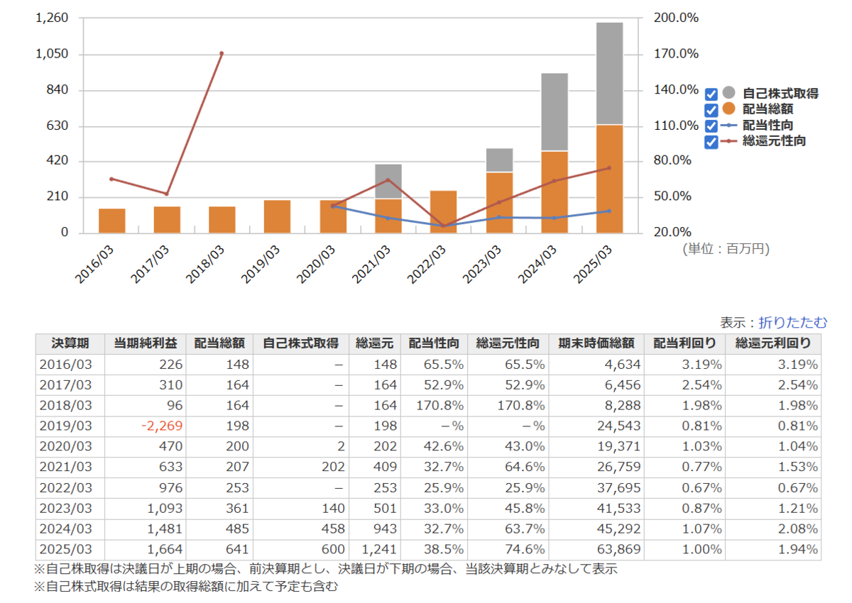 | 総資産(億) | 自己資本(億) | 自己資本比率(%) | 配当余力(年) | 配当性向 |