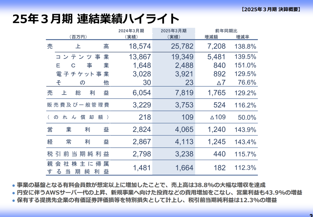 セグメントの稼ぐ力:2Q累計の外部売上はコンテンツが主力(例:15,107百万円のうちコンテンツ12,962百万円、電子チケット2,125百万円)。利益面もコンテンツ比重が高い。